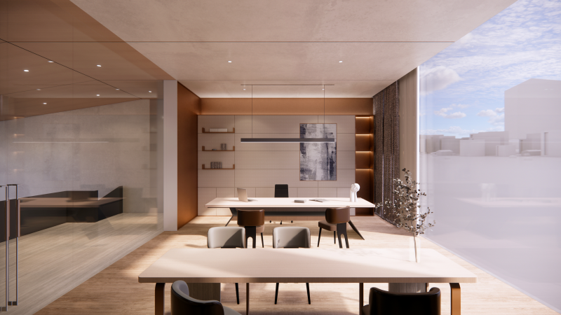 暖杏色与墙壁挂画和谐过渡,既有西方的清爽简约,又有中国江南的美感,睿智冷静的气势从办公桌缓缓蔓延开来。