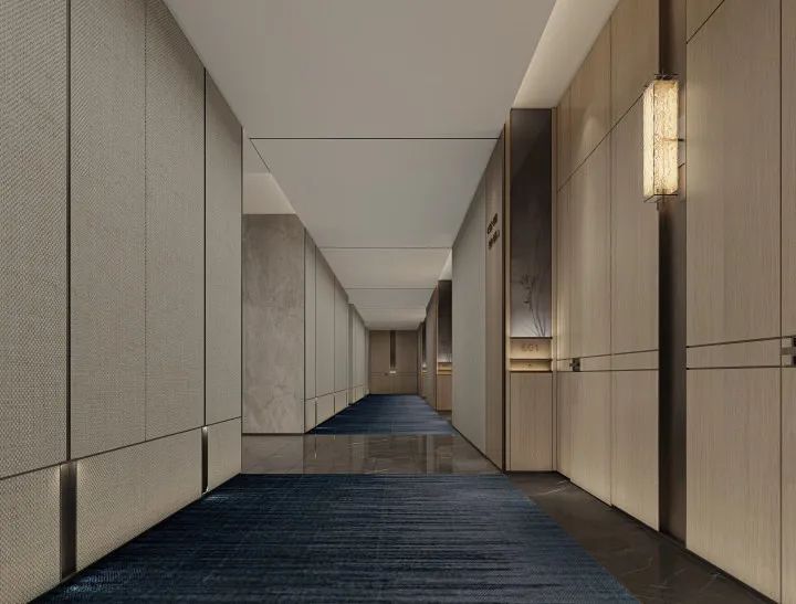电梯厅走廊采用木饰面、梵克雅灰大理石、金属等材质,打造明暗交替的等待空间,房间号上方的装饰画更是奠定了整个空间的雅致基调,此刻,等待成为一种美好。