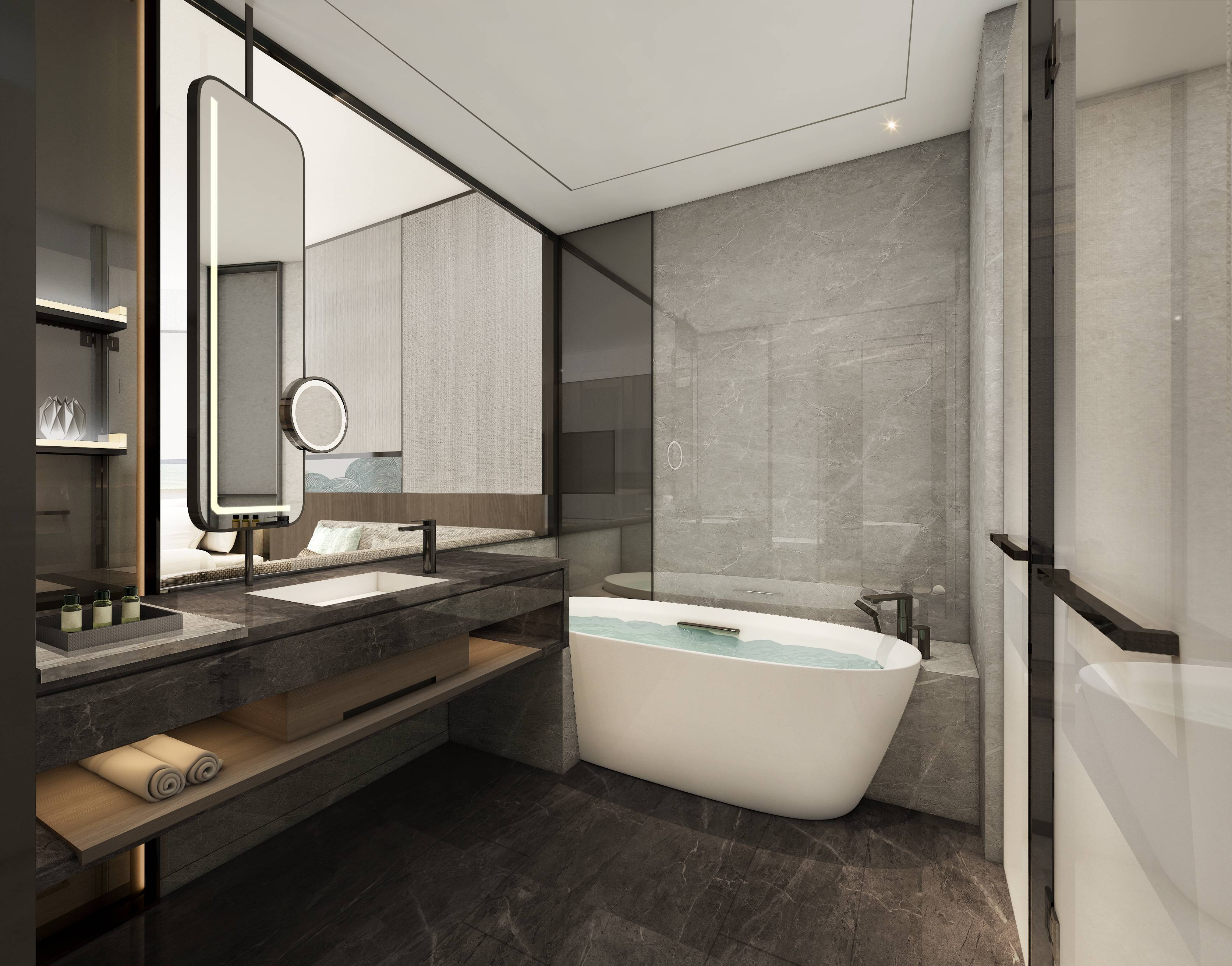 规整的简约线条,边角的灯光,平实中自带韵味。大理石一深一浅,一刚一柔,依其丰富的纹理质感,将空间轻奢风格崭露于眼前,是新意,亦是心意。